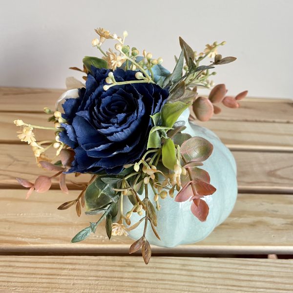 - Winter Blues featuring shades of blue and white wood flowers with silver accents